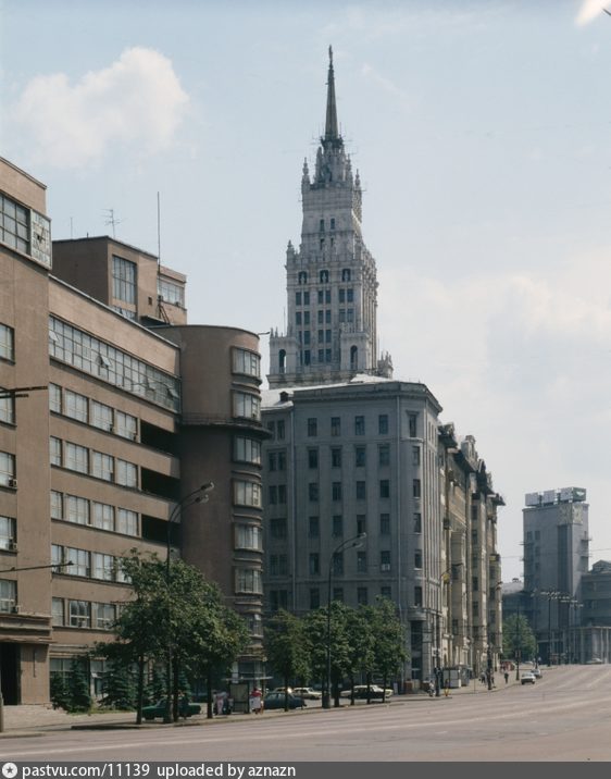 Все три дома видны на верхнем фото. Обратимся к первому из них. Это ярко-красное здание Наркомата земледелия (сейчас Министерство сельского хозяйства), которое выходит разными фасадами на Садовое кольцо, проспект Сахарова и Орликов переулок. Это работа великого Щусева, причем чуть ли не единственная выполненная в стиле конструктивизма. Хотя строго говоря, это работа не столько самого Щусева, сколько его мастерской, где у Щусева было немало соавторов. Здание построено в 1928-1933 годах.