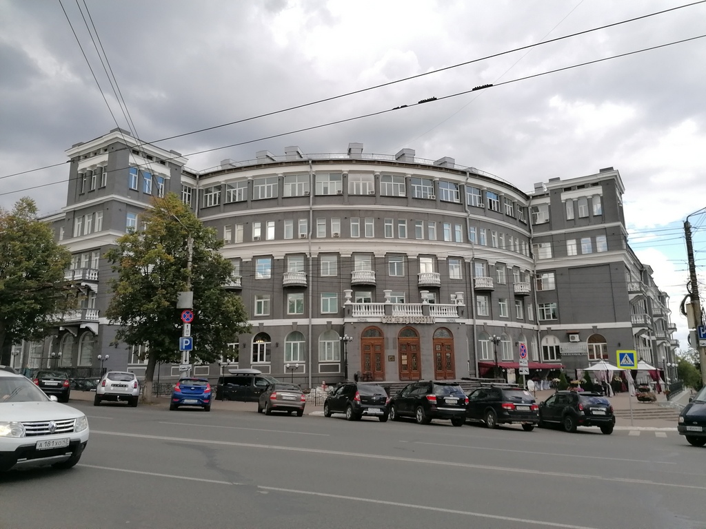 Кстати, форма гостиницы имеет объяснение. На ее месте стоял Воскресенский собор, архитектор был его прихожанином, он в нем венчался и крестил сына. Собор был снесен незадолго до строительства гостиницы. Проект был составлен так, что здание как бы "закруглялось" вокруг фундамента церкви, и место, где она стояла, так и осталось незастроенным...